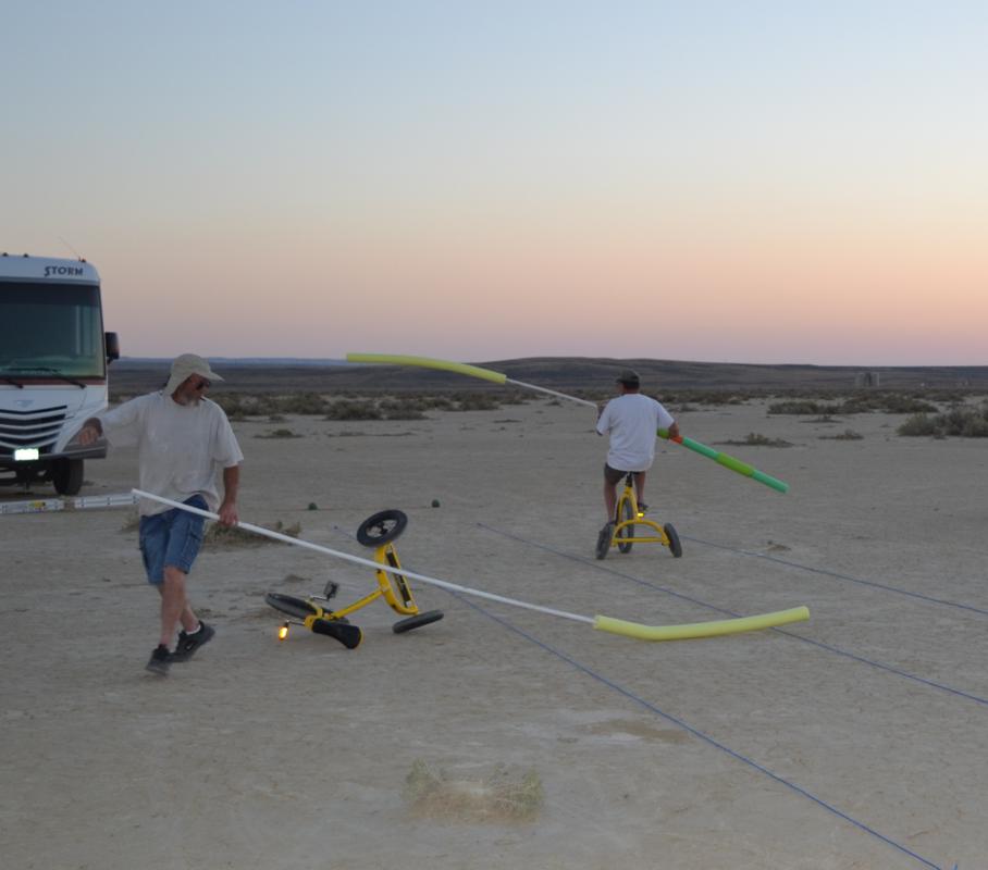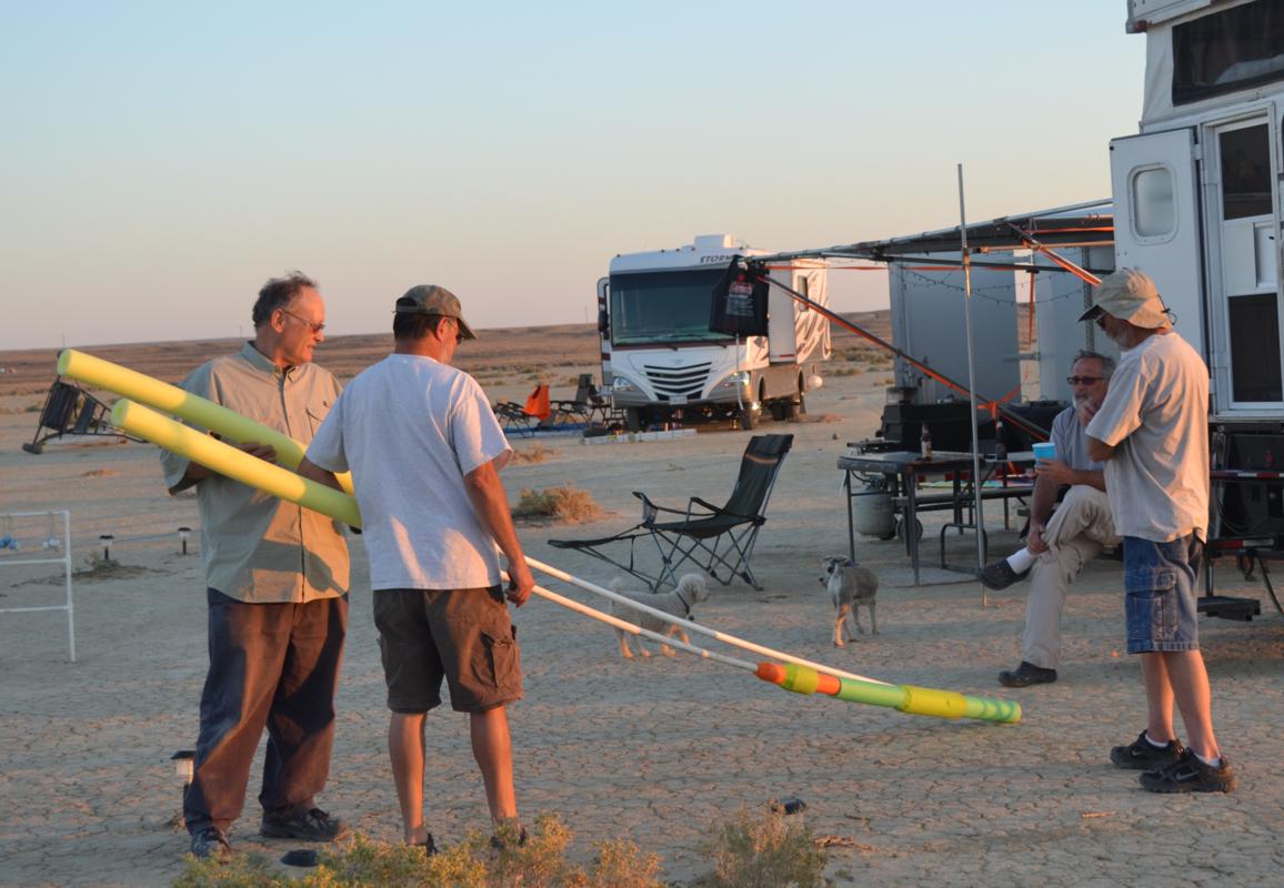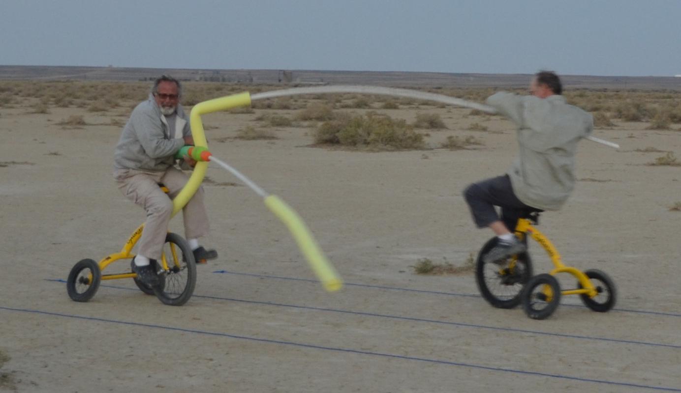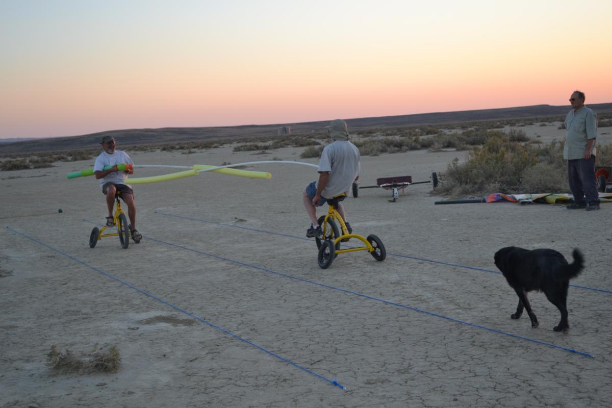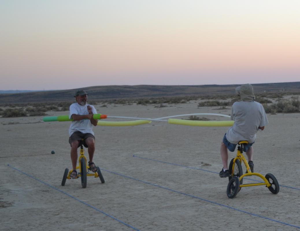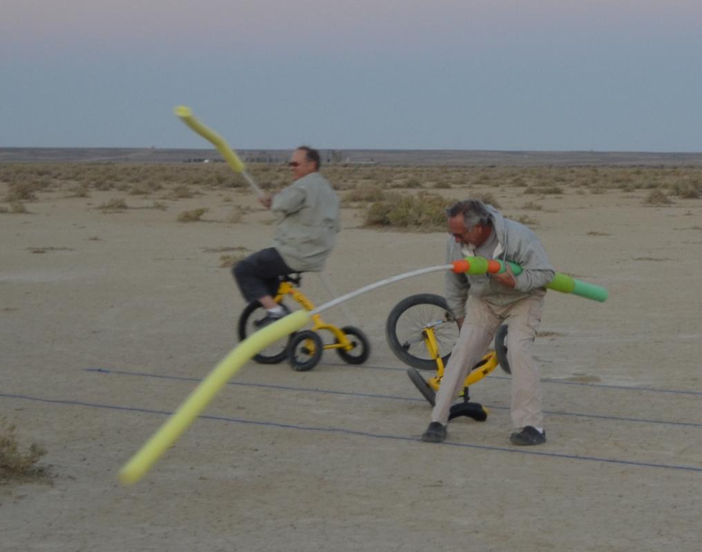 Take a look at some video of our first joust. The first joust took place during a landsailing trip to Wyoming. We laid out the list using three 50' pieces of rope staked to the ground. Unfortunately, neither of us had assembled armour, so we decided to go for it anyway. It only hurts 'til the hurt goes away. The first order of contention turned out to be lance design. I had taken great pains to build a lance, using various chunks and diameters of foam noodle to fashion a handle with a comfortable grip as well as a hand guard. On the other hand, my opponent simply jammed a foam noodle tip onto the PVC pipe and called it good. There was some debate over the legality of my design; in the end it was allowed, most likely due to the fact that I wrote the rules. After that was cleared up it was time to joust. A joustmaster was appointed and we were ready. We took our places at opposite ends of the list and charged on. Now, you would think that it would be relatively easy to aim a lance and strike your opponent in the chest, after all we are not going very fast nor is the opponent very far away. Wrong! It turns out to be very difficult to hit the target. It was also tough to stay in bounds. However, it is a total blast. I did not make it around to the start line so Dennis took a victory run. I paid him back next round. Lionel and Dave were up next.