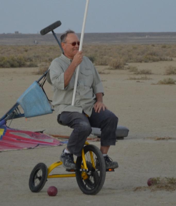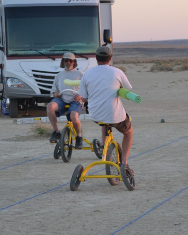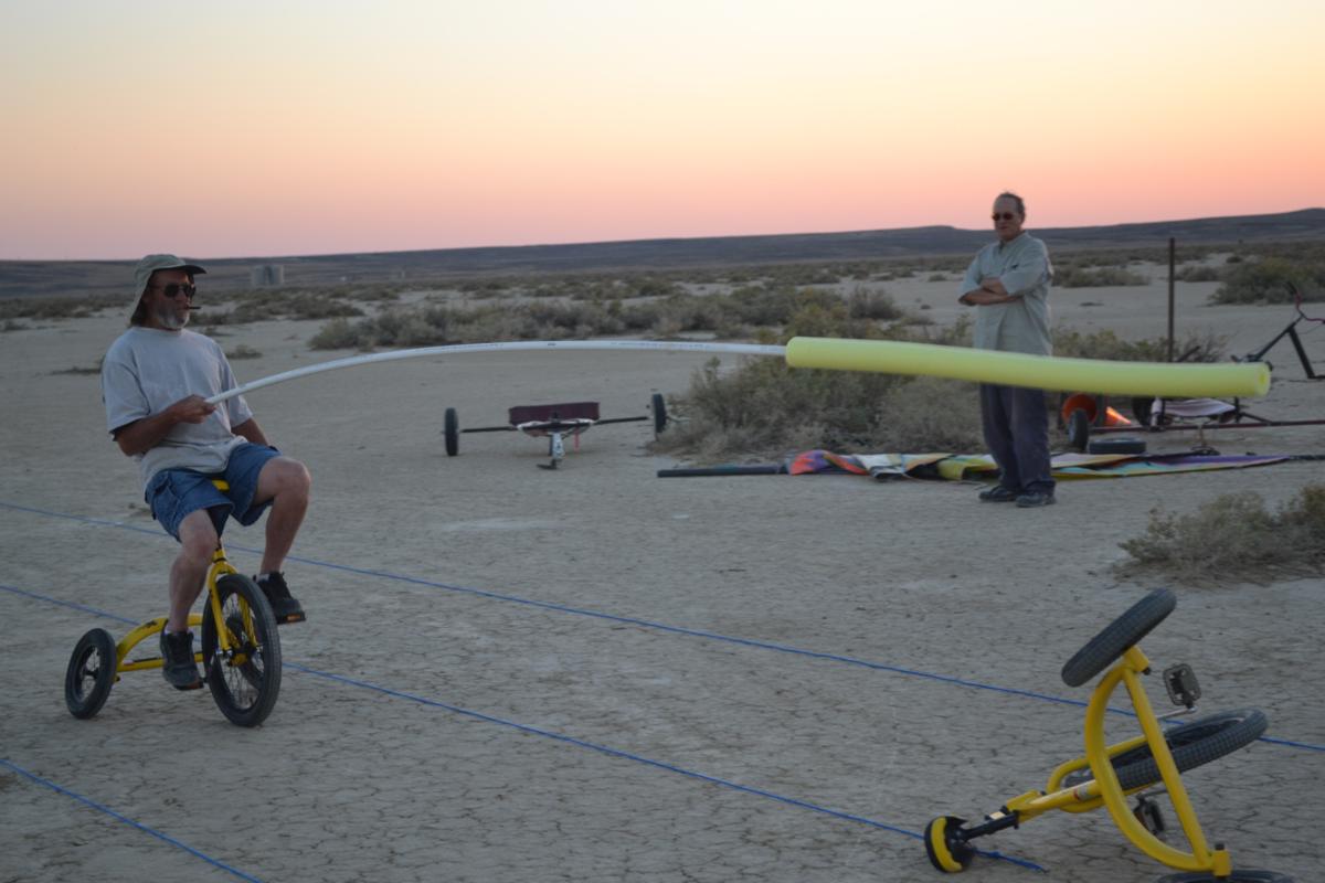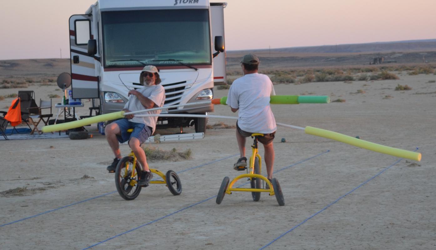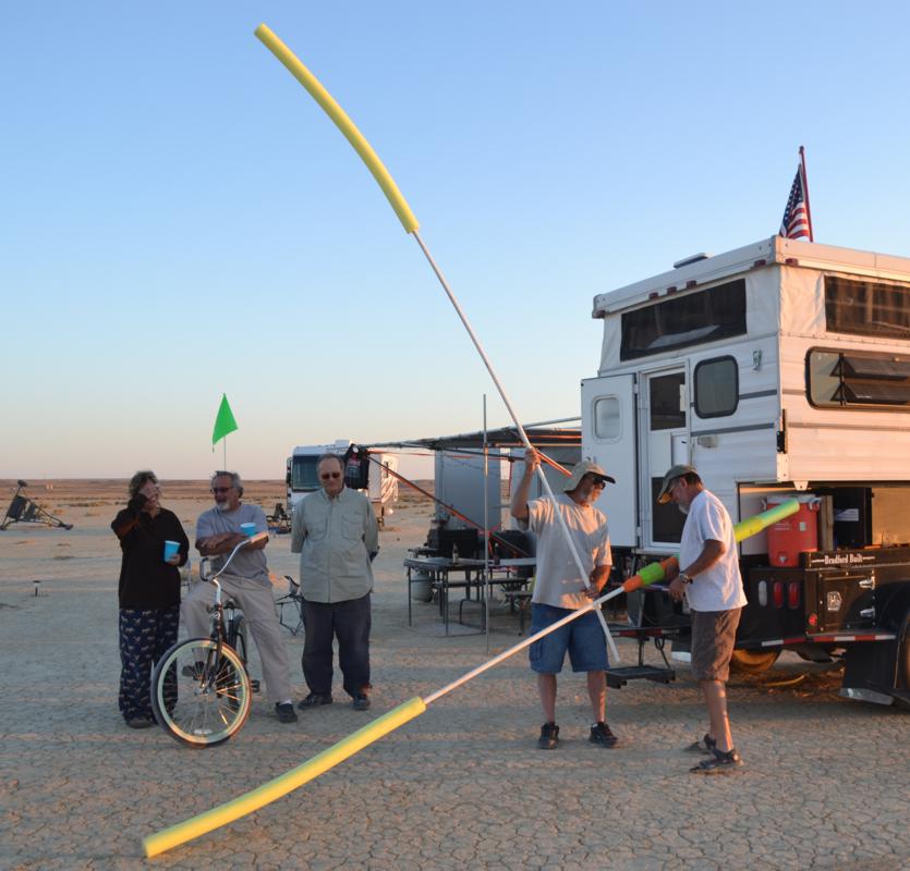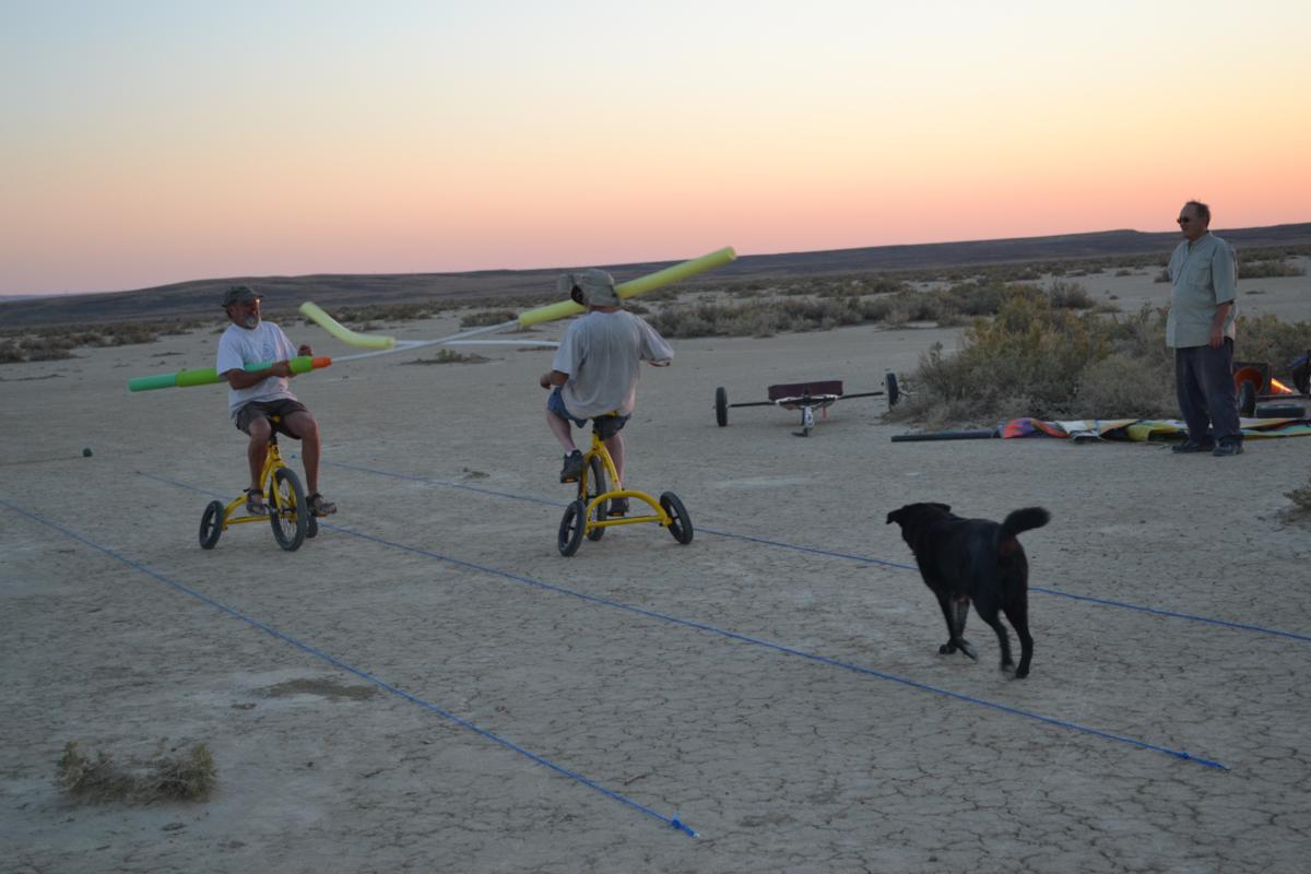 Take a look at some video of our first joust. The first joust took place during a landsailing trip to Wyoming. We laid out the list using three 50' pieces of rope staked to the ground. Unfortunately, neither of us had assembled armour, so we decided to go for it anyway. It only hurts 'til the hurt goes away. The first order of contention turned out to be lance design. I had taken great pains to build a lance, using various chunks and diameters of foam noodle to fashion a handle with a comfortable grip as well as a hand guard. On the other hand, my opponent simply jammed a foam noodle tip onto the PVC pipe and called it good. There was some debate over the legality of my design; in the end it was allowed, most likely due to the fact that I wrote the rules. After that was cleared up it was time to joust. A joustmaster was appointed and we were ready. We took our places at opposite ends of the list and charged on. Now, you would think that it would be relatively easy to aim a lance and strike your opponent in the chest, after all we are not going very fast nor is the opponent very far away. Wrong! It turns out to be very difficult to hit the target. It was also tough to stay in bounds. However, it is a total blast. I did not make it around to the start line so Dennis took a victory run. I paid him back next round. Lionel and Dave were up next.