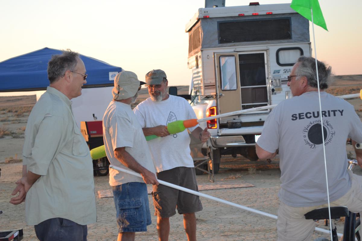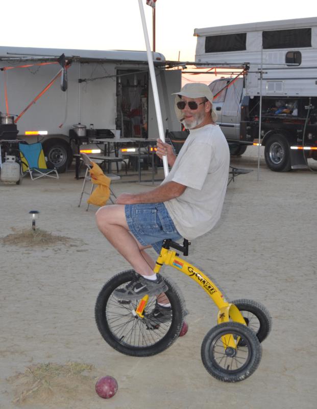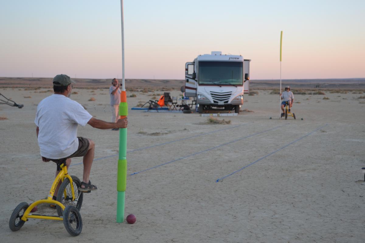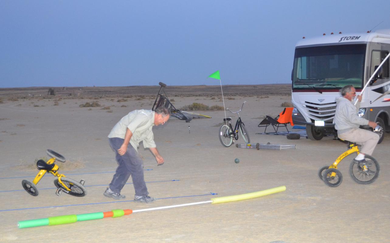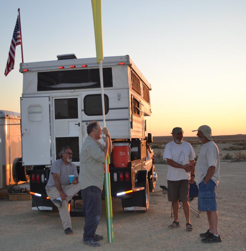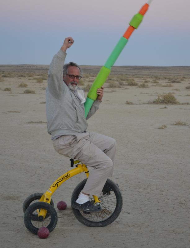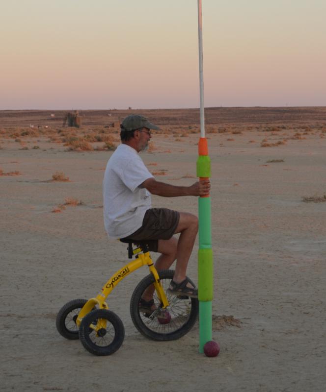 Take a look at some video of our first joust. The first joust took place during a landsailing trip to Wyoming. We laid out the list using three 50' pieces of rope staked to the ground. Unfortunately, neither of us had assembled armour, so we decided to go for it anyway. It only hurts 'til the hurt goes away. The first order of contention turned out to be lance design. I had taken great pains to build a lance, using various chunks and diameters of foam noodle to fashion a handle with a comfortable grip as well as a hand guard. On the other hand, my opponent simply jammed a foam noodle tip onto the PVC pipe and called it good. There was some debate over the legality of my design; in the end it was allowed, most likely due to the fact that I wrote the rules. After that was cleared up it was time to joust. A joustmaster was appointed and we were ready. We took our places at opposite ends of the list and charged on. Now, you would think that it would be relatively easy to aim a lance and strike your opponent in the chest, after all we are not going very fast nor is the opponent very far away. Wrong! It turns out to be very difficult to hit the target. It was also tough to stay in bounds. However, it is a total blast. I did not make it around to the start line so Dennis took a victory run. I paid him back next round. Lionel and Dave were up next.